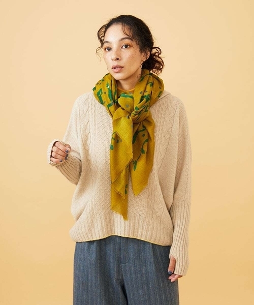 アニマルモチーフが目を惹くストール。パッと目を惹く配色とホコモモラらしい柄がコーディネートのポイントになってくれます。毛とシルクをブレンドした柔らかな肌触りで心地よく、やや薄手なのでロングシーズン活躍してくれます。シンプルなスタイリングや物足りなさを感じる時のプラスワンにもおすすめのアイテムです。