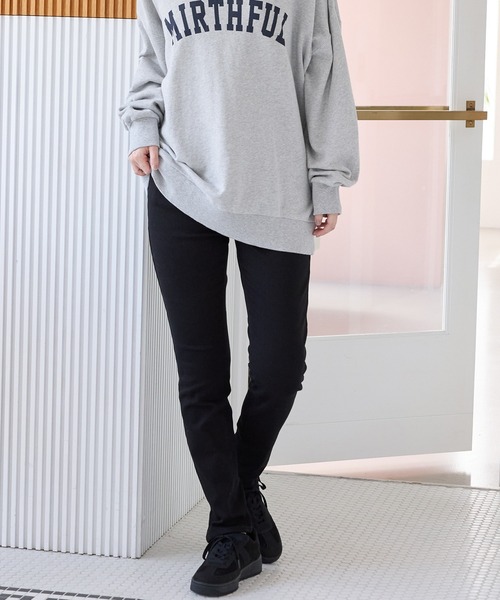 ゆるっとしたニットやスウェットと合わせてメリハリをつけるコーデがおすすめ。