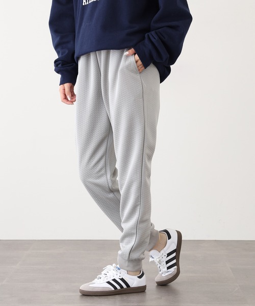 ダイヤ柄キルティングの無地ジョガーパンツは、秋冬のユニセックススタイルにぴったりなアイテム。