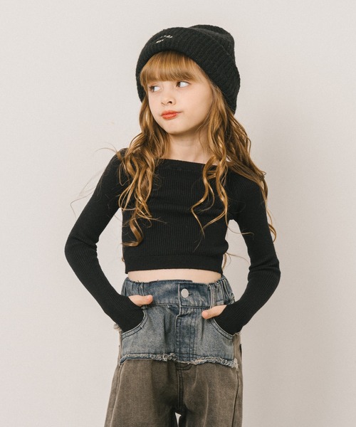 着心地のよい柔らかいリブニット生地のフィンガーホールが可愛いニットトップス。