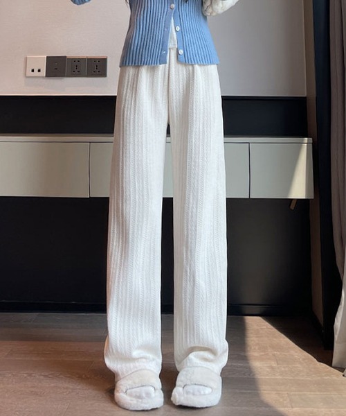 シーズンムード漂うケーブル編み風デザインのゆったりワイドパンツ。