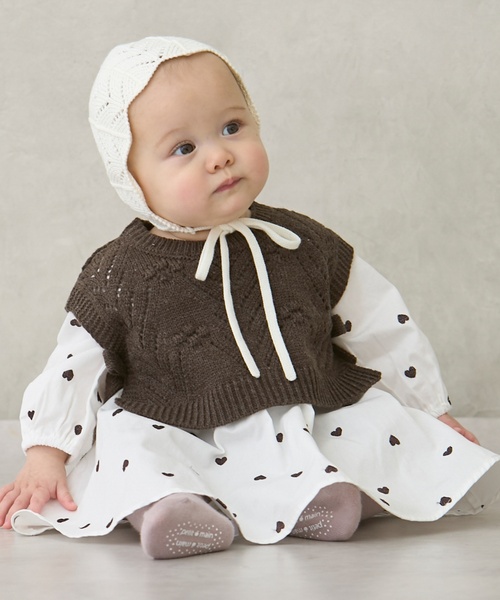 透かし編みのベストと総柄ワンピースのセットアップです。
