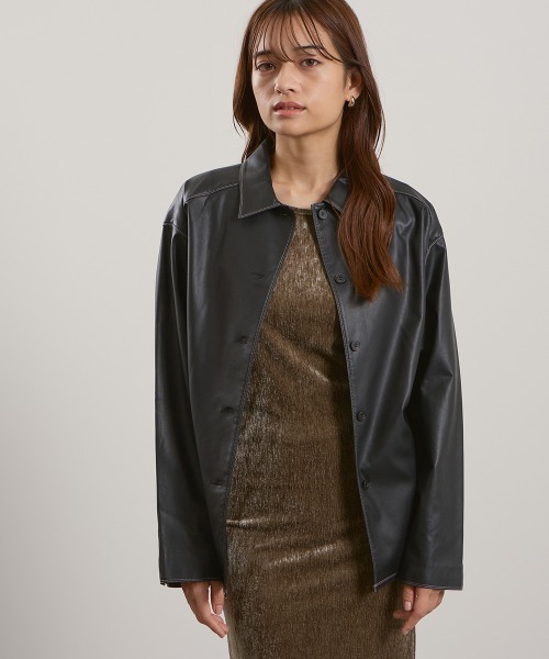 リアルに近い質感やタッチにこだわった、非常に柔らかく、肌触りが良いシープレザーのような合皮素材を使用したカバーオール型ジャケットです。