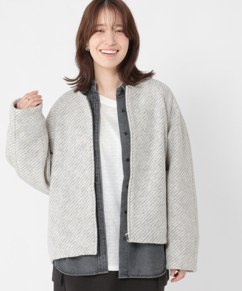 カーディガン感覚で羽織れるコクーンシルエットのノーカラーブルゾン。