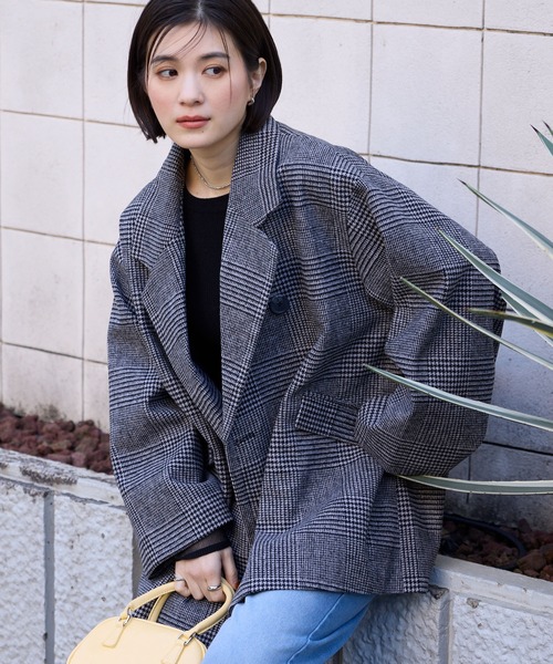 クラシカルなグレンチェック柄が印象的なダブルブレストショート丈コート。