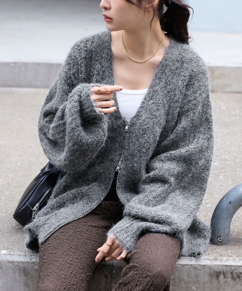 ふんわり起毛感とボリュームスリーブが魅力のVネックオーバーサイズカーディガン。