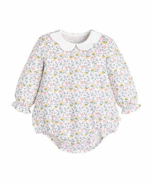 襟がポイントのロンパース。花柄を使用し、女の子らしく可愛らしい仕上がりにしました。注意)こちらの商品は全サイズ、「横開き」となりますので予めご了承ください。洗濯方法:手洗い