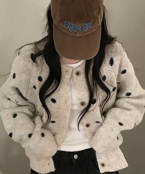 可愛らしいドット柄で華やかに。クルーネックニットカーディガン