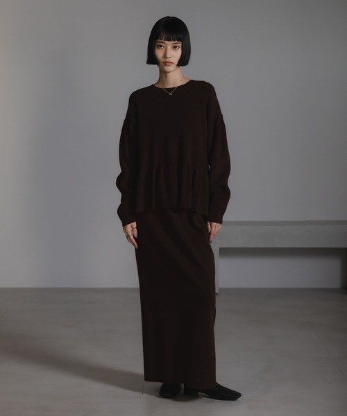 トレンドのペプラムのニットトップスと、ストレートシルエットのスカートのセットアップです。