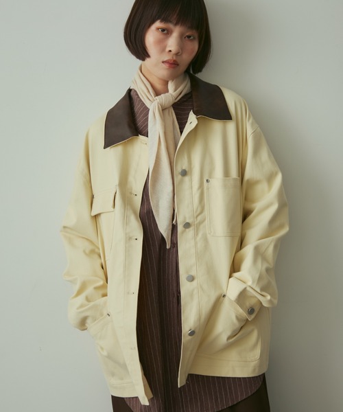 衿にはセミマットなフェイクレザーを使用、身頃部分は厚手のコットン生地で秋口のライトアウターにぴったりです。