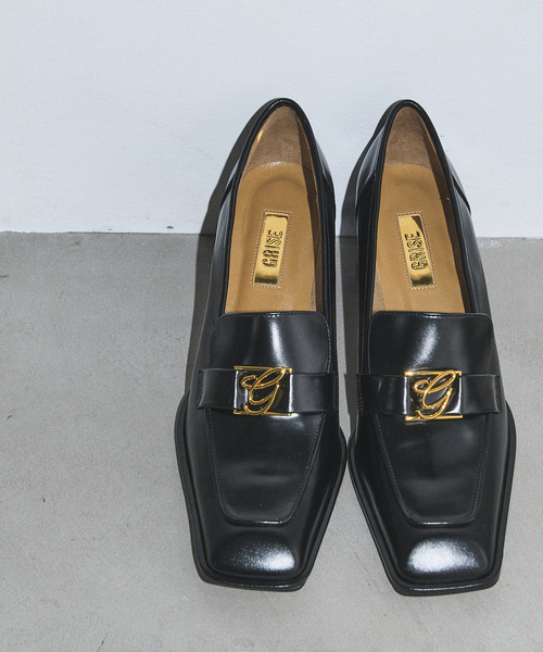 サークル状のエッジを効かせたトウ先とメタルのロゴモチーフで、シンプルながらもモードな足元を演出してくれるヒールローファー。