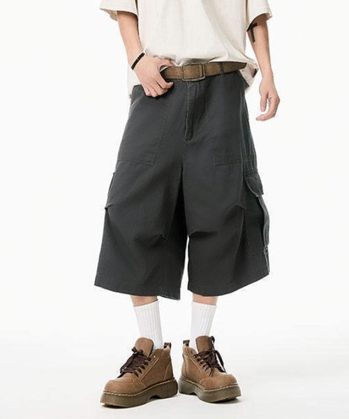 気負いのなりカジュアルなテイストが魅力のカーゴパンツを、ルーズ感のある七部丈にお作りしたハーフパンツ。ウエスト位置を落として少しルーズに着こなせばストリートライクなテイストが楽しめ、サイドのフラップポケットがユーティリティー性のあるアクティブな表情に。ポケット下の位置から入れたタックが立体的なフォルムを作り出し、シンプルなTシャツに合わせるだけでニュアンスのあるスタイリングが叶います。