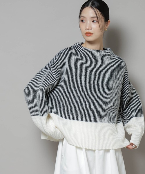 目を引くバイカラーとシャドーストライプのデザインが魅力のニットトップス。リラクシーなワイドシルエットで着心地が良く、デイリーの着回しに重宝します。