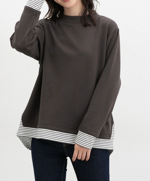 1枚でおしゃれに決まる、裾からボーダーTシャツをのぞかせたようなレイヤード風デザイン。
