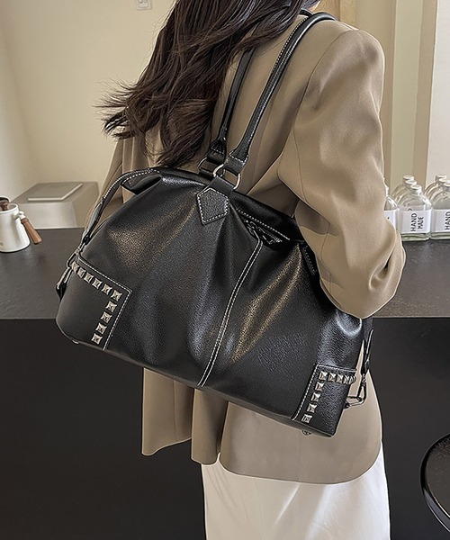 【洗練されたデザインの2WAYショルダー&ボストンバッグ】大人の装いにマッチする、上品でモードな印象の2WAYバッグ。シンプルなデザインながらもスタッズディテールがアクセントになり、程よい存在感を放ちます。ショルダーバッグとしてもボストンバッグとしても使える万能仕様で、シーンに合わせてスタイルチェンジが可能です。