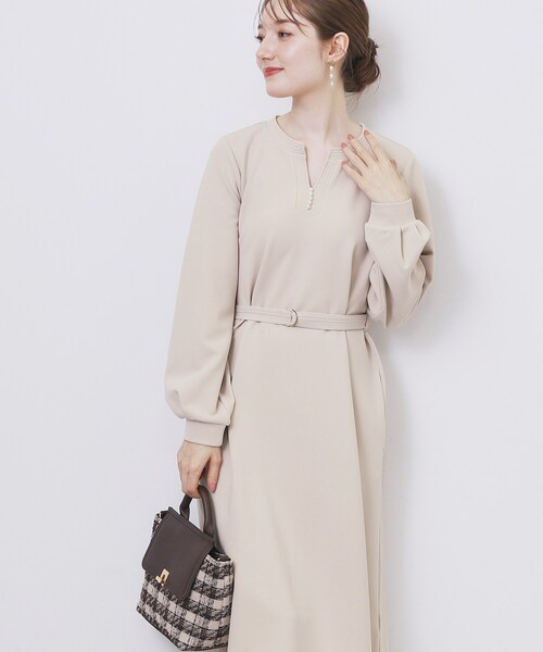 キーネックにパール調釦があしらわれた上品なワンピース