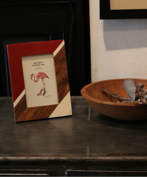 ビンテージのオールを思わせるウッドとその上にペイントされたカラーがモダンなデザインの写真立て。