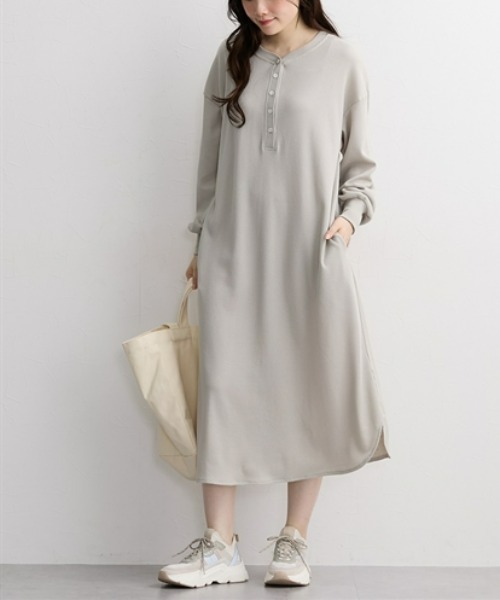 やわらかなワッフル素材の長袖ワンピースです。
