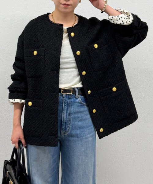 表面感のあるツイード生地に、上品な輝きを放つゴールドボタンをあしらい、存在感と高級感を演出しました。
