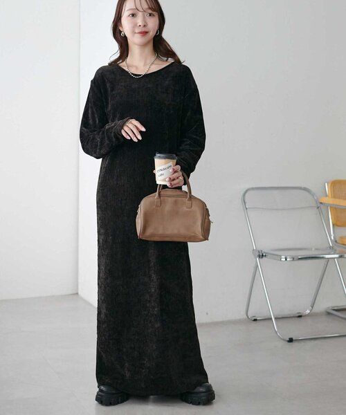杢ベロアの表情が映える、シンプルで上品な一枚●デザイン杢ベロアならではの、奥行きのある色合いと上品な光沢が魅力のワンピース。