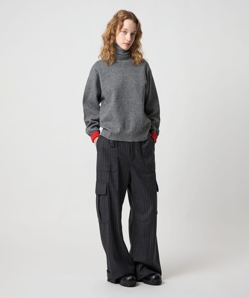 表面の毛羽を刈り込んでドレープ感のある風合いに加工した毛織生地で仕立てたカーゴパンツ。