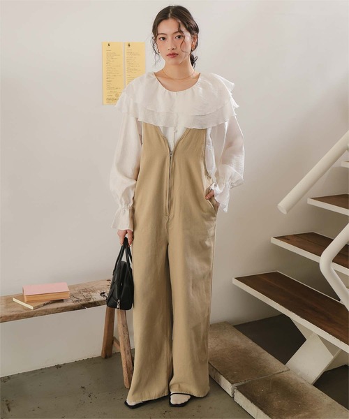 大人の抜け感と女性らしさを両立した、フロントファスナー付きデニムサロペット。