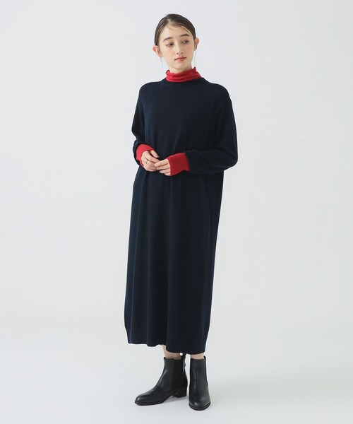 緩やかなタートルネックと、裾に向かって丸みを帯びたコクーンシルエットが特徴。タートル部分が配色になっていて、1枚で様になるアイテムです。
