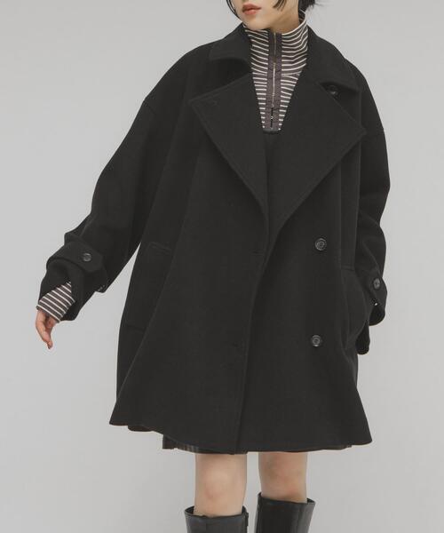 【秋冬の着こなしを格上げするBIGカラーコート】BIGカラー仕様が顔周りを華やかに仕上げるアウター。衿に釦が設定されているので、スタンドカラーとしても着用可能です。また、後ろに大きなタックが入っており、ウエストのタブもポイントになっています。袖は調整可能な釦付きになっており、小さくすると少し丸みが出ます。程よくリラックスしたシルエットと、腰回りがカバーできる絶妙な丈感は、パンツやスカートどちらにも合わせやすいです。