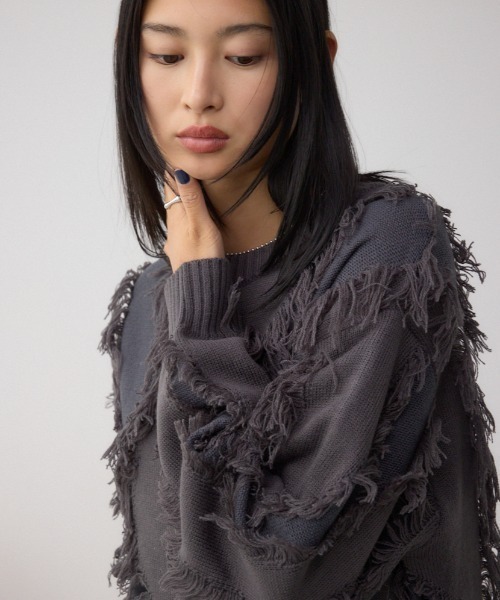 流線状に入ったフリンジで動きのあるデザインニットです。