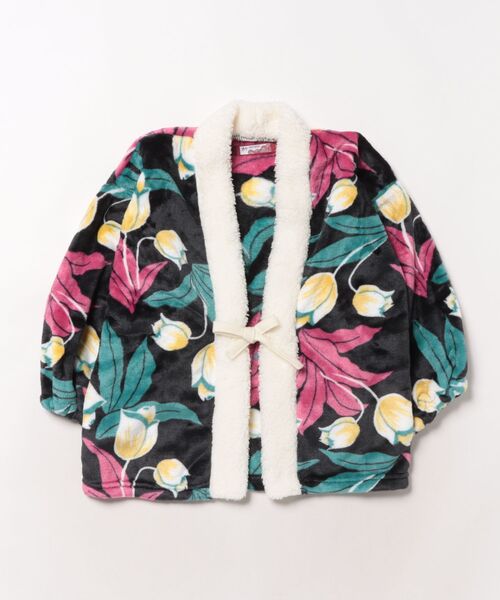 日本の花や浮世絵などのモチーフをデザインした、ブランケット生地で作られた子ども用半纏(はんてん)。