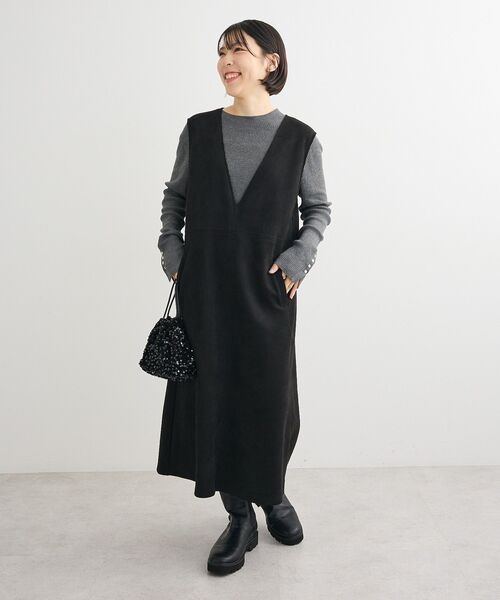 滑らかな風合いと微光沢のあるフェイクスエード素材で仕立てたジャンパースカート。