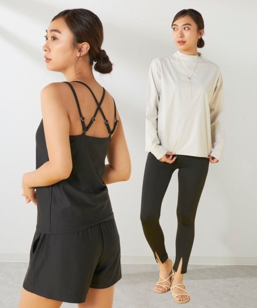 モックネックラッシュガード・カップ付きキャミブラ・ハイウエストショーツ・ショートパンツ・レギンスが揃った着回し自在なセット。