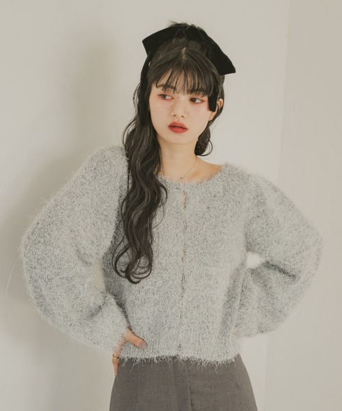 ラメ入りの長い毛足が目を惹くダンスヤーン素材のカーディガン