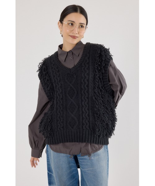 ループ編みとケーブル編みの組み合わせで立体的な表情に仕上げたニットベスト。