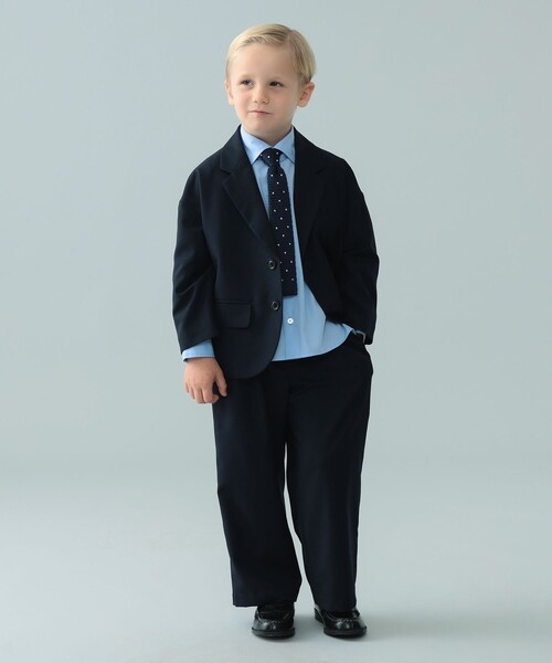 入学式など特別な日にも心地よくゆったりとしたシルエットが魅力のセットアップスーツ。とろみのある上質な生地で、全体的にリラックスしつつもスマートに着こなせるデザインです。シャツはインでもアウトでもおしゃれに着こなせ、シーンに合わせたスタイルが楽しめます。ニット素材のネクタイはドット刺繍が施されており、さりげないアクセントに。