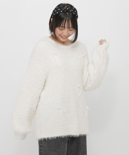 可愛らしいリボンモチーフがアクセントになったフェザーニットプルオーバー。