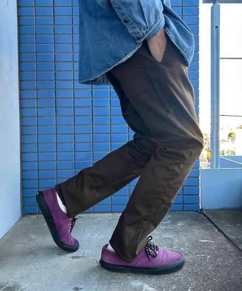 シャツやニット、スウェットなど幅広いトップスと合わせやすく、全体をすっきりとまとめやすいデザインです。