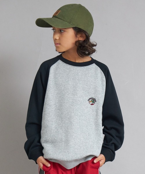 配色ラグランスリーブとカモの胸刺繍がポイントのトレーナー。
