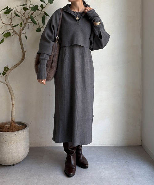 短丈のフロントファスナープルオーバーと、リブニットワンピースの組み合わせで、こなれ感たっぷりのスタイリングが完成します。