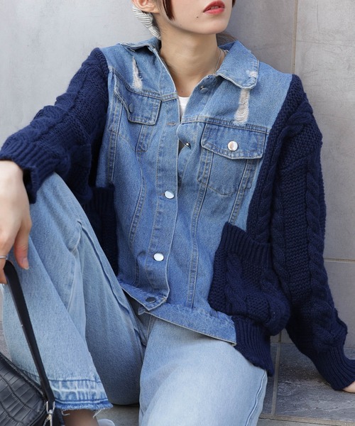 異素材使いがトレンドライクなニットジャケットカーディガンニットとデニムの切り替えデザインがおしゃれなジャケット。