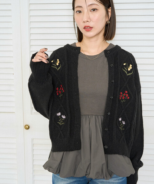 ●表面感のあるケーブル編みにポコポコした花刺繍を施したトレンドカーディガン