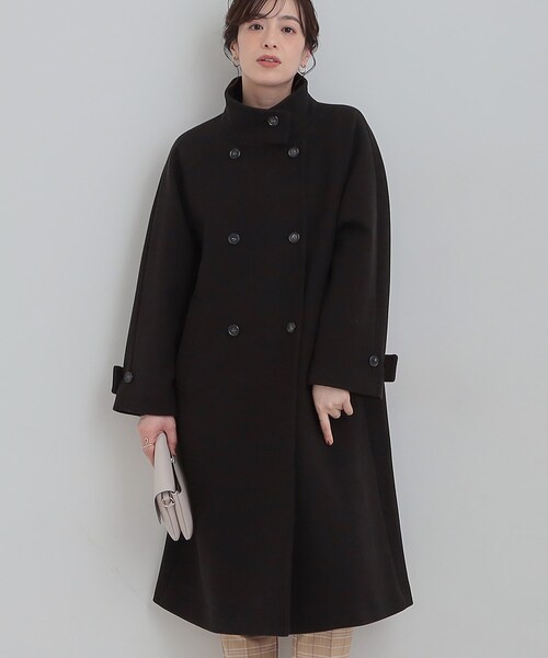 スタンドネックで、フロント部分がダブルになったロングコートです。
