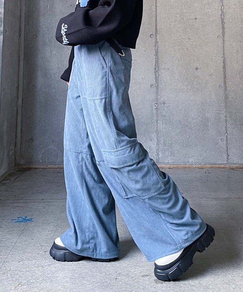 キーワード:カーゴパンツ レディース ウエストゴム ハイウエスト フルレングス フレアパンツ ワイドパンツ 無地 秋 冬
