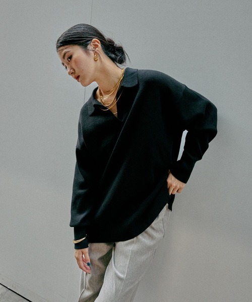 スキッパーが深すぎないので、一枚でも安心して着られます。