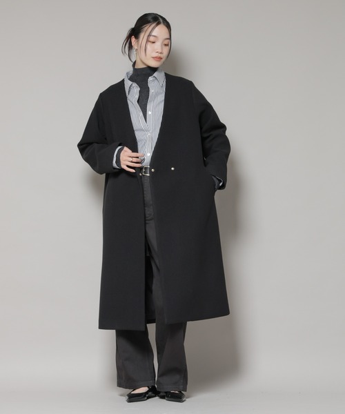 シャープな首元に無駄な装飾の無いシンプルなデザインが都会的なVネックノーカラーコート。程良くゆとりはありつつオーバー過ぎないサイズ感も魅力。パンツもスカートも合わせやすい、重すぎない着丈感が使い勝手良いおススメのアウターです。