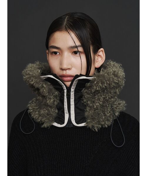 フロントはMA-1の持ち出しのようなステッチが入ったデザイン。ジップオープンなので、髪型やメイクを気にせず着脱できます。サイドに付いているコードで調整して首元にフィットさせることができます。内側は温かい起毛素材を使用。大きすぎない、程よいサイズ感がコーディネートしやすいポイント。