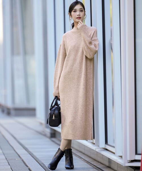 ・ハイネックでゆったりとしたシルエットのニットロングワンピース