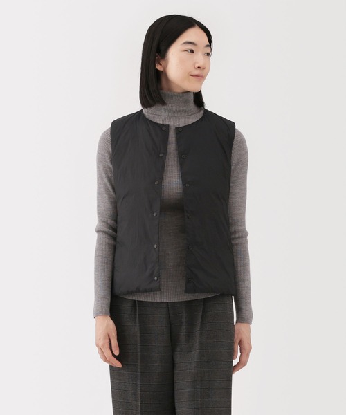 ステッチレス仕様にアップデートし、すっきりとした印象に仕上げました。インナーとしてもアウターとしても便利に活用でき、クリーンテイストのアウターとの重ね着もしやすくなりました。