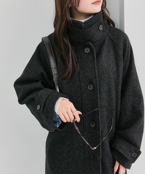 ・スタンドカラーとして使える襟が特徴で生地感が高見えするロングコート。襟元の小さなプレートが上品なアクセントに。