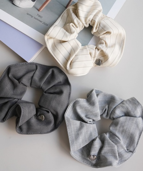 シックなカラーのストライプ生地にワンポイントでハートをあしらったシュシュ。